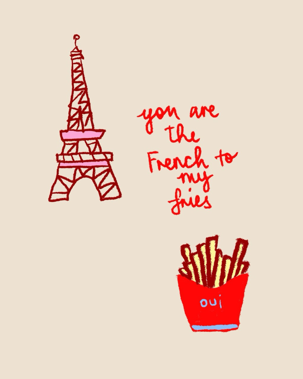 Featuring a hand-drawn illustration of the Eiffel Tower and a carton of French fries, this card is perfect for expressing appreciation to that special woman who completes you—just like French fries and France!