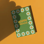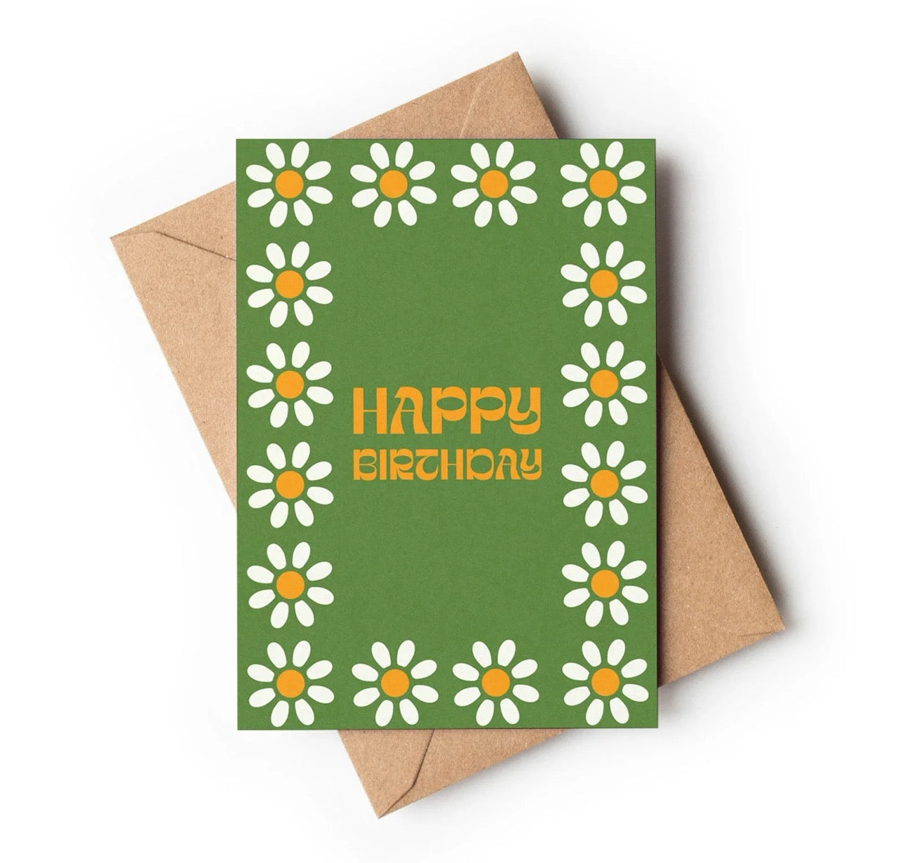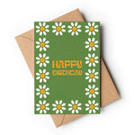 Happy Birthday card in a bright green background and a vintage-inspired daisy border.