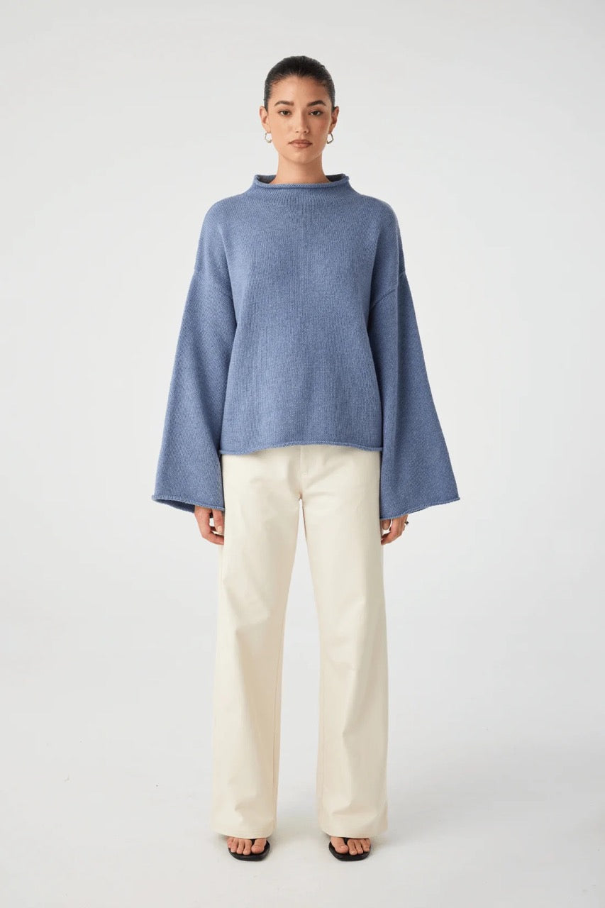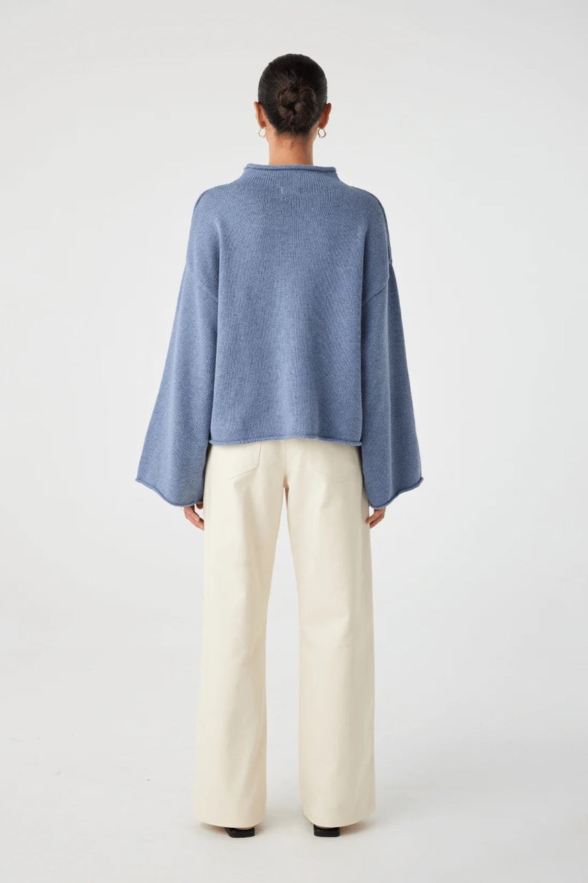 The Maeve Sweater is relaxed yet refined, with a cropped silhouette, funnel neck, and wide sleeves for easy movement. Crafted from a soft cotton-merino blend, it offers warmth with a breathable feel.