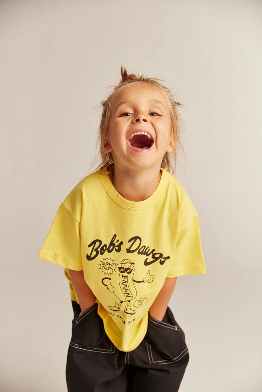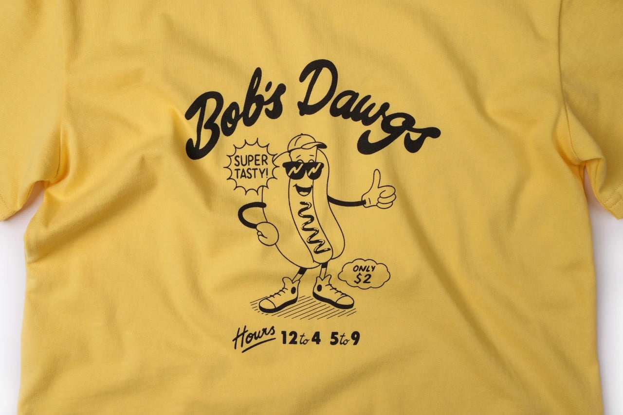 Our Bob's Dawgs tee is all about comfort and cool - made from 100% organic cotton jersey certified by GOTS. Designed in our new classic tee fit for easy, everyday wear. Featuring Bob the Dog, AKA Bob's Dawgs, alongside a playful hot dog graphic screen-printed front and centre - fun yet understated in one solid colour.