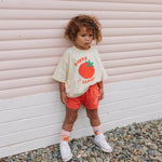 The Happy Tomato Tee is made from 95% cotton jersey, 5% spandex with an incredibly soft hand feel. The print is inspired by our love of home grown tomatoes and how happy they make us feel!