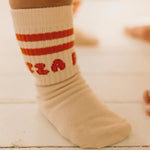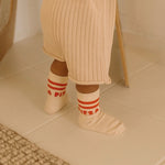 The Pizza socks are the perfect finishing touch for your little one's outfit. Our ribbed socks are designed with reinforced toe caps featuring two stripes and PIZZA to the top of each sock, with the Golden logo to the footbed. The print is inspired by the simple joy ones get from a slice (or 10!) of PIZZA. Choose your favourite toppings and voila, life complete.