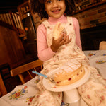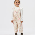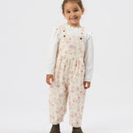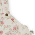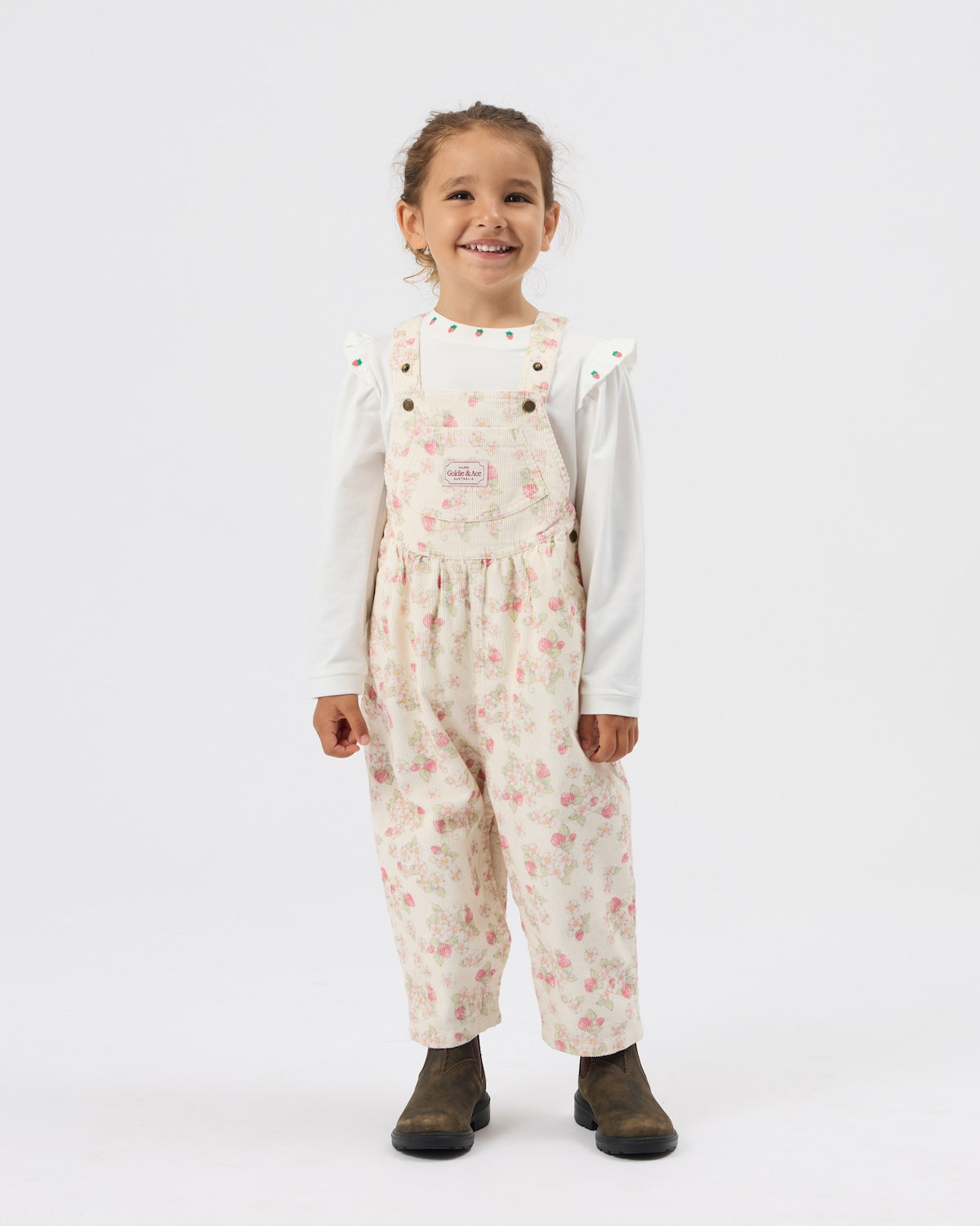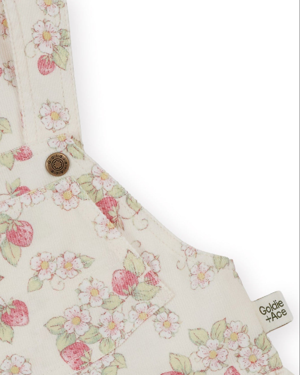 Cream cotton corduroy overalls with a vintage strawberry print and adjustable straps – a playful little number made for climbing, collecting treasures, and exploring strawberry fields.