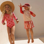 Swim shorts - not too tight & not too loose, for a board short fit that works all day long! Dolphin hem binding & elastic waist with drawstring