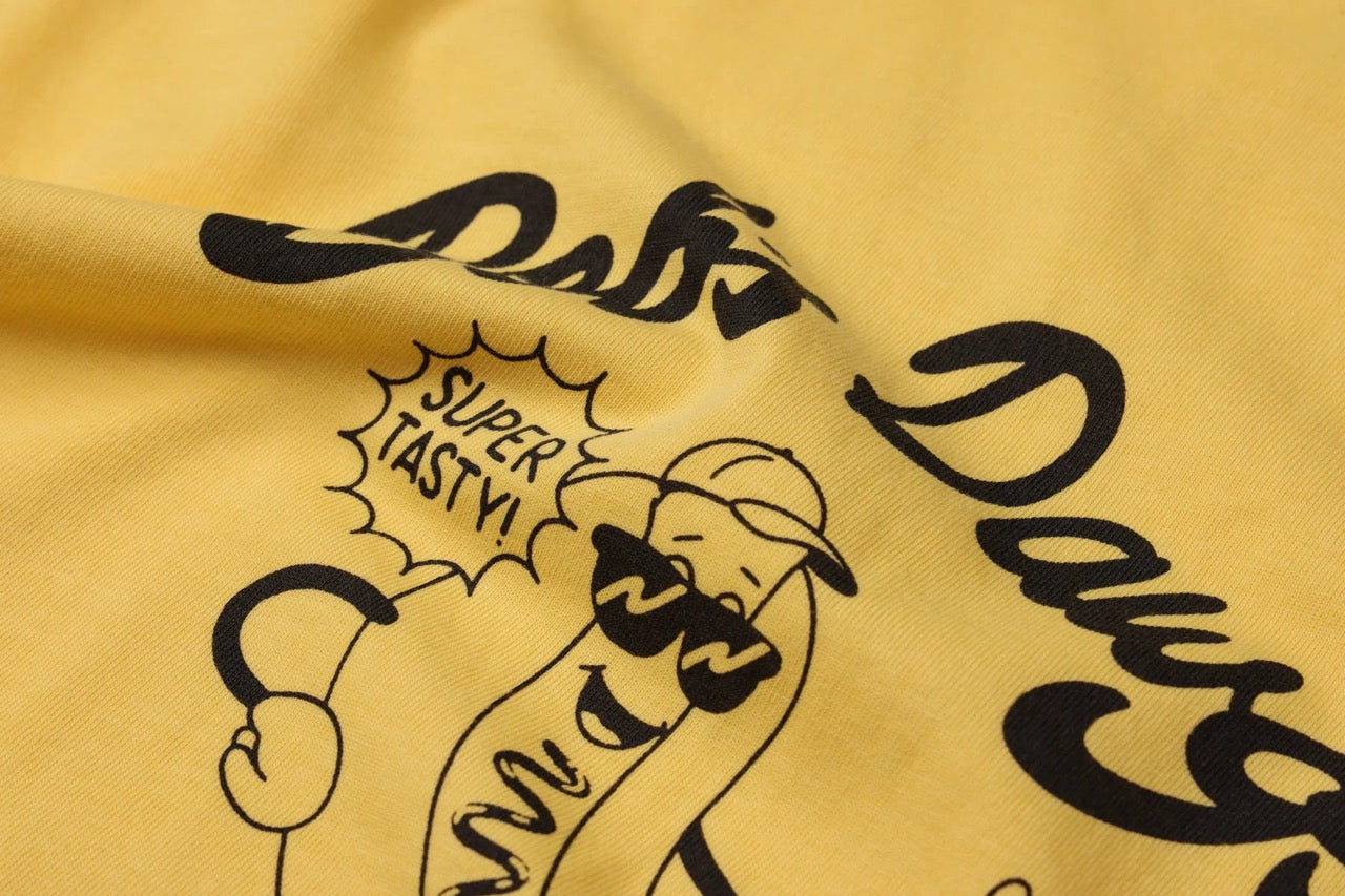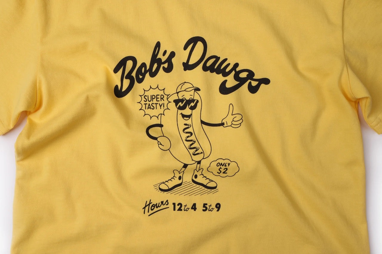 Our Bob's Dawgs tee is all about comfort and cool - made from 100% organic cotton jersey certified by GOTS. Designed in our new classic tee fit for easy, everyday wear. Featuring Bob the Dog, AKA Bob's Dawgs, alongside a playful hot dog graphic screen-printed front and centre - fun yet understated in one solid colour.