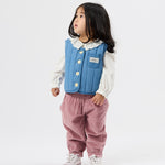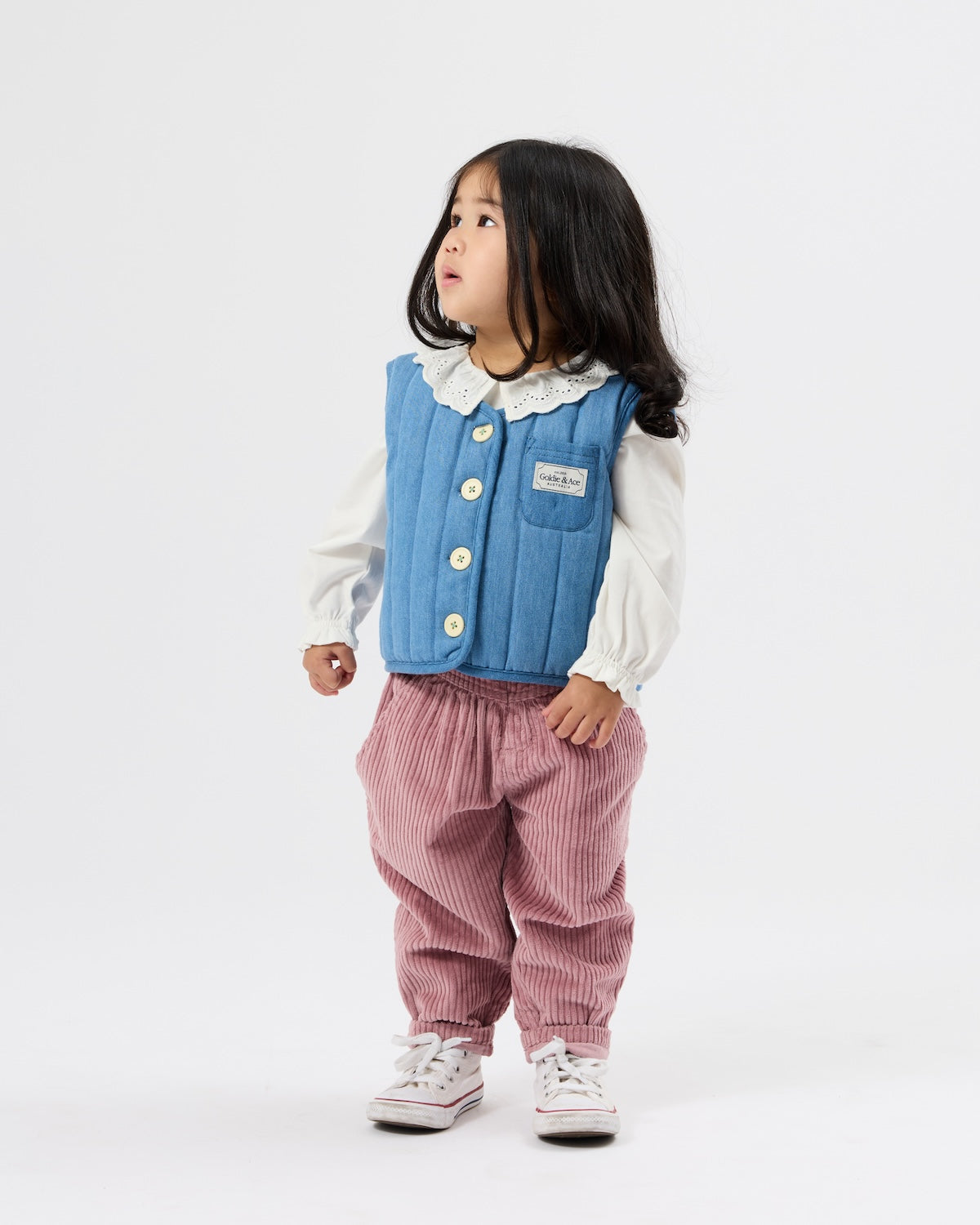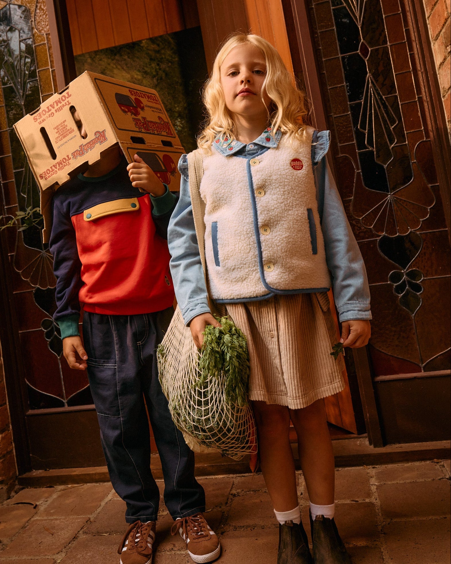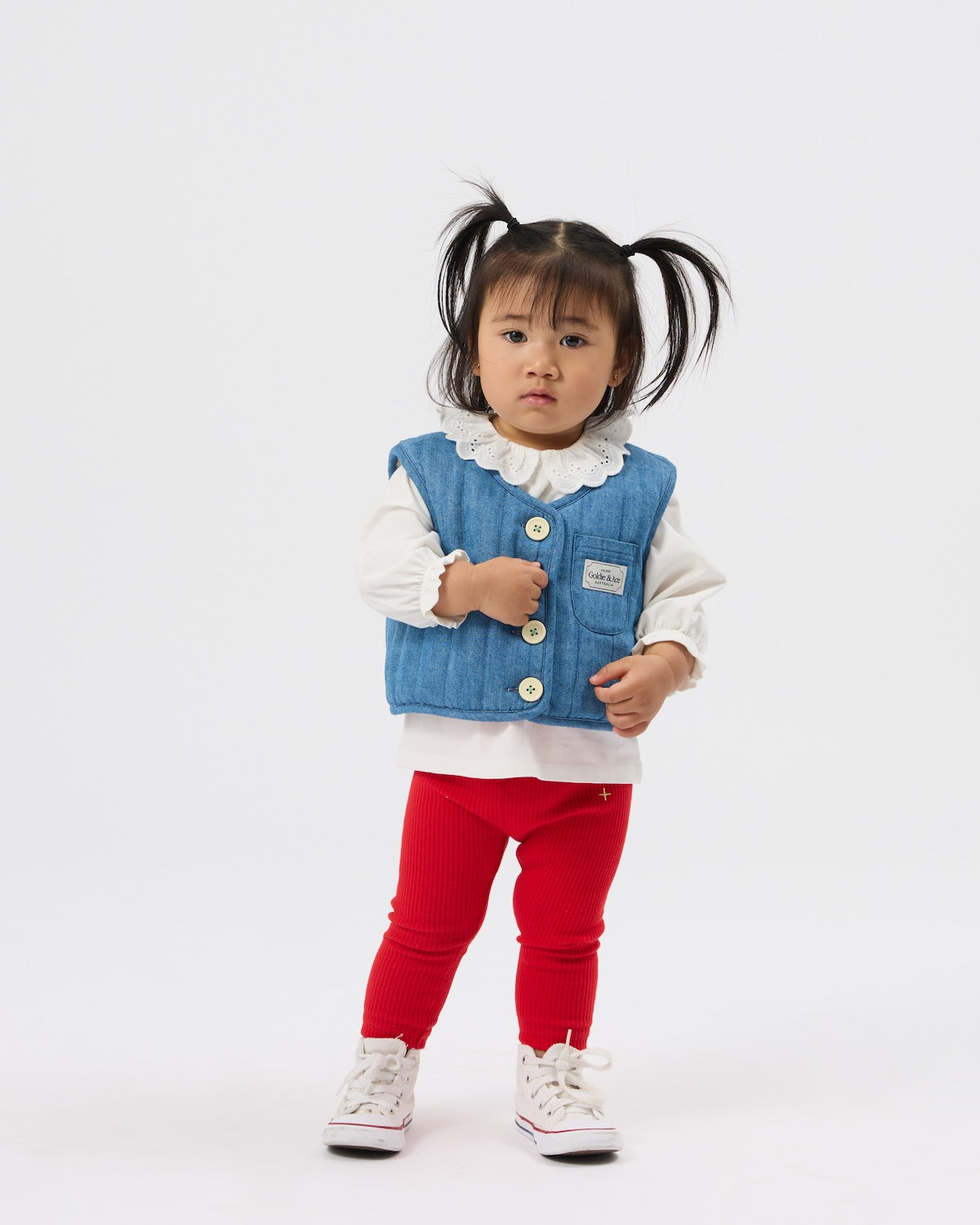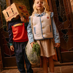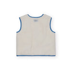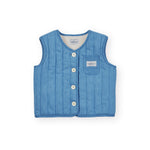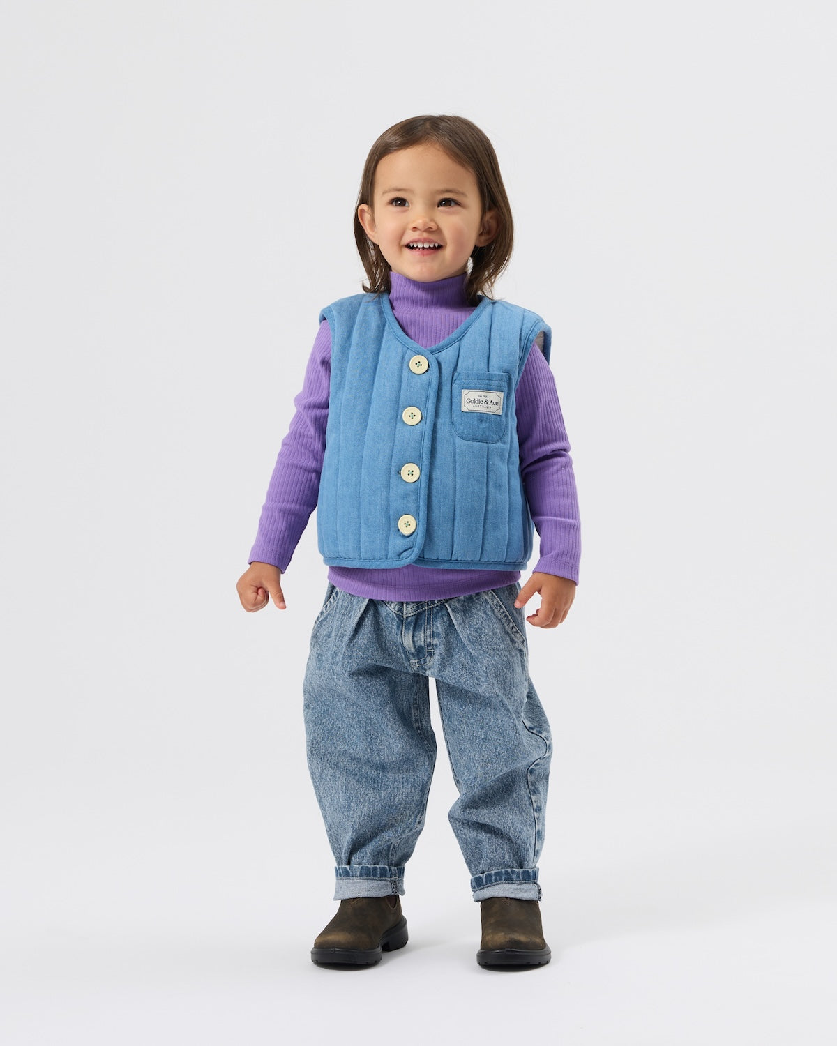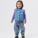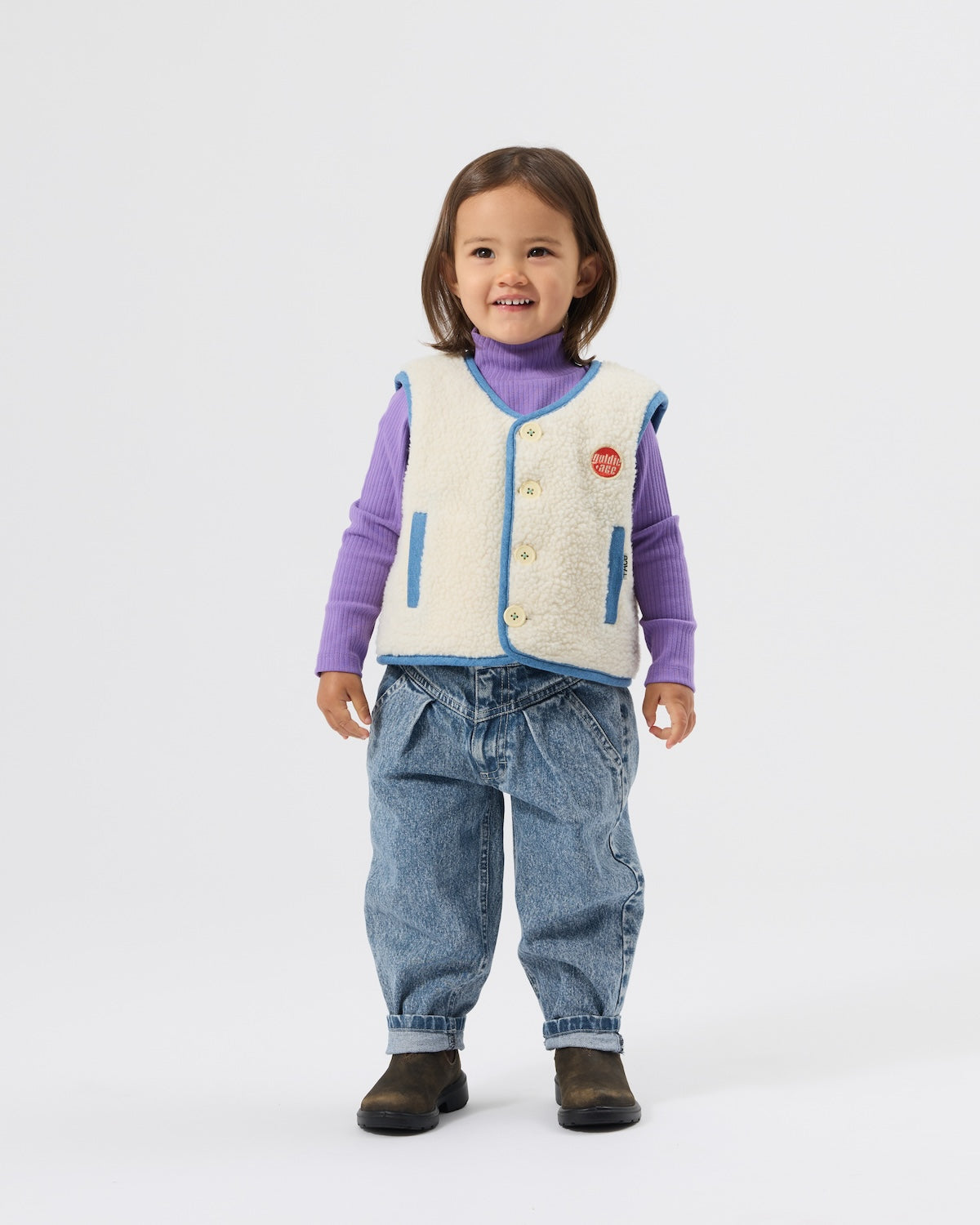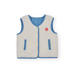 Natural and vintage blue vest with a reversible design – two ways for quick mood-changes, cosy faux shearling one side, soft chambray the other, and pockets for little treasures.