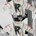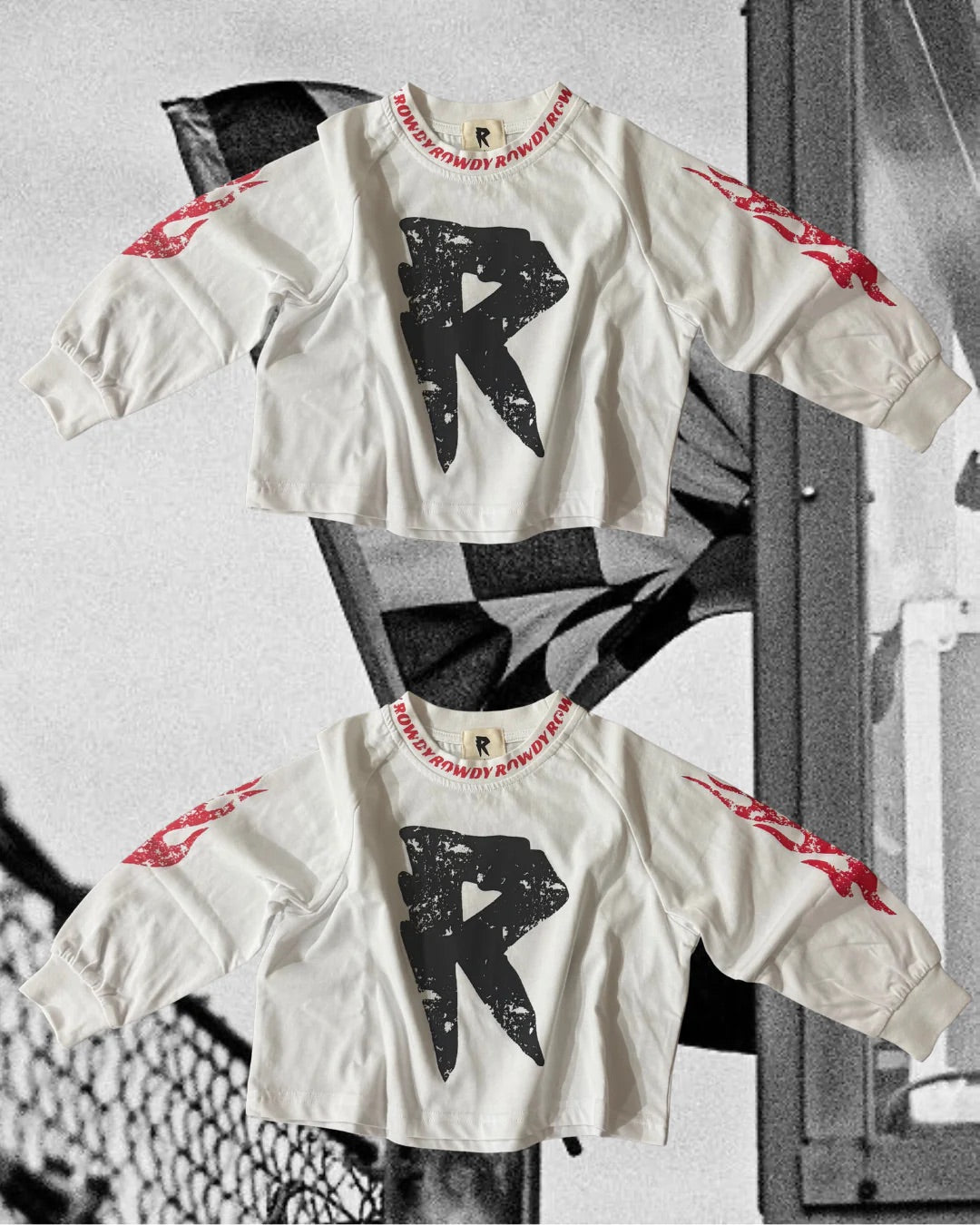 The Rowdy Racer is a Raglan style long-sleeve shirt that features custom logo prints across the chest, arms & back.