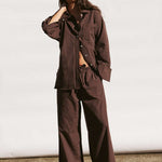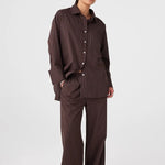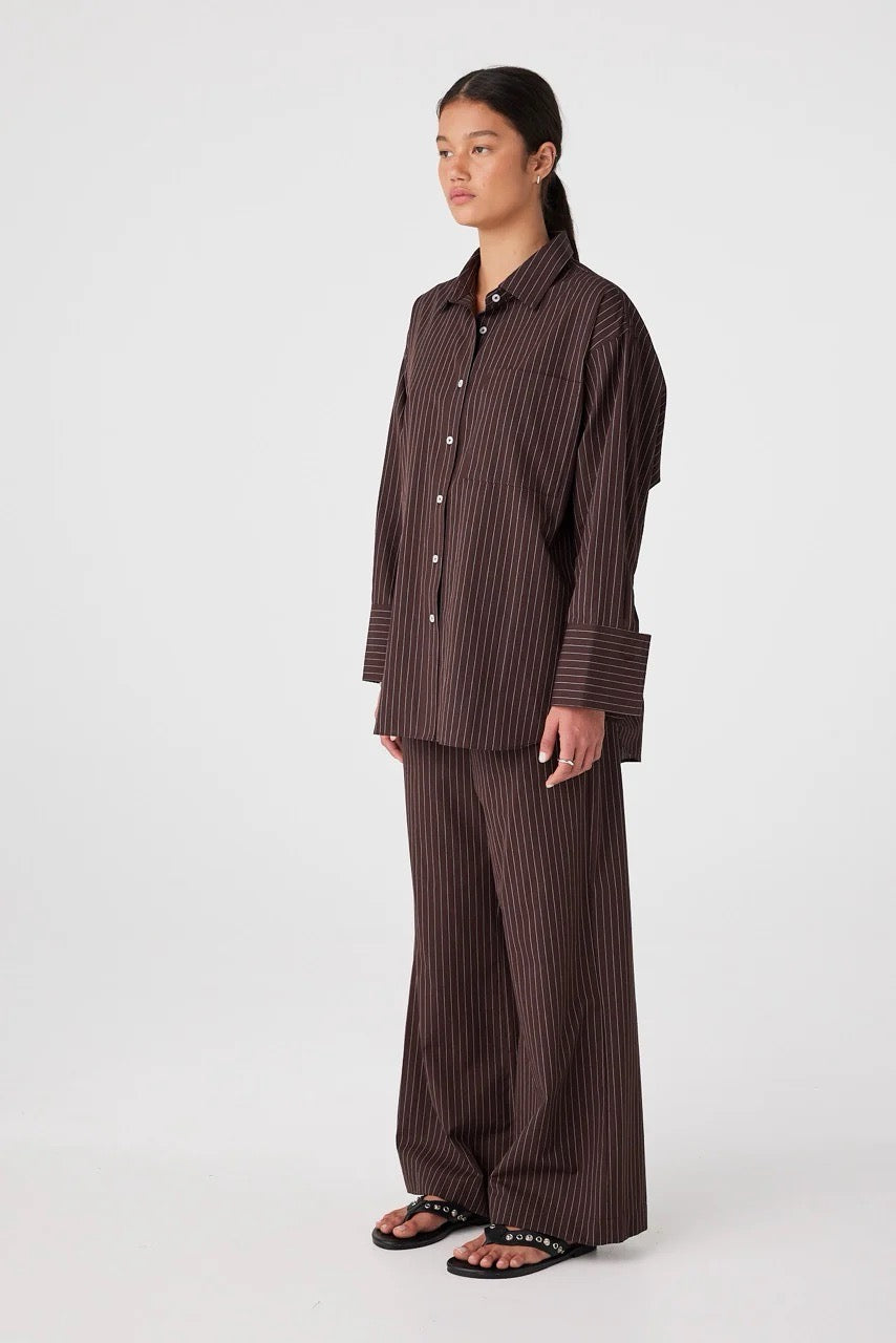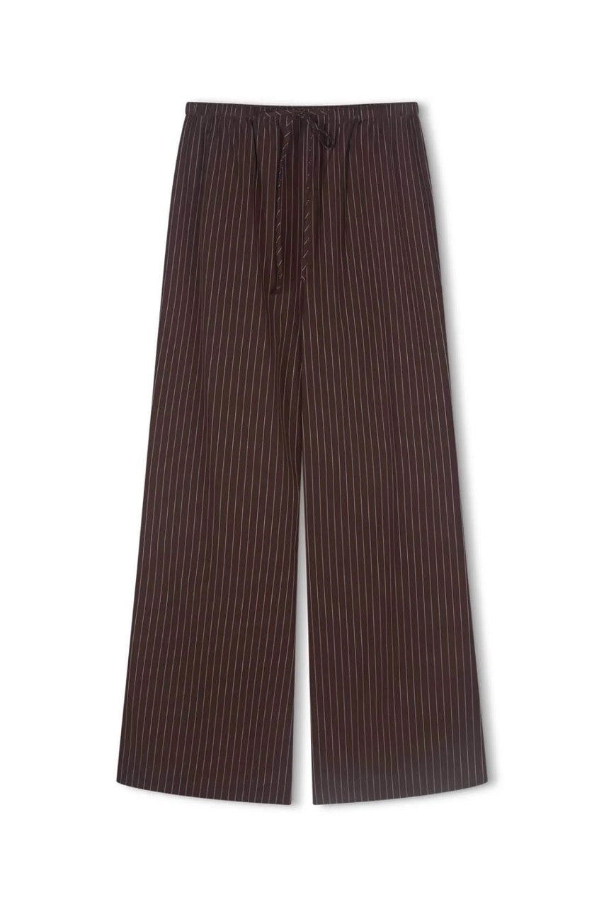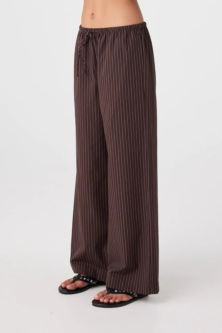 Straight leg cotton pants in Arcaa’s espresso stripe, designed with a soft elasticated waistband and internal drawcord. Relaxed fit through the hip and leg offers comfort for everyday movement, lounging or travel.