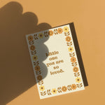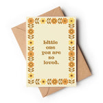 "Little One You Are So Loved" greeting card with a border of vintage inspired daisies, a soft buttery back ground and the words "Little One You are So loved" across the centre. This card is perfect for an expecting mother, newborn baby or a little ones birthday.