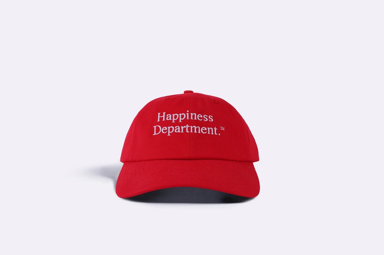 - Red cap with 'Happiness Department' embroidered in white