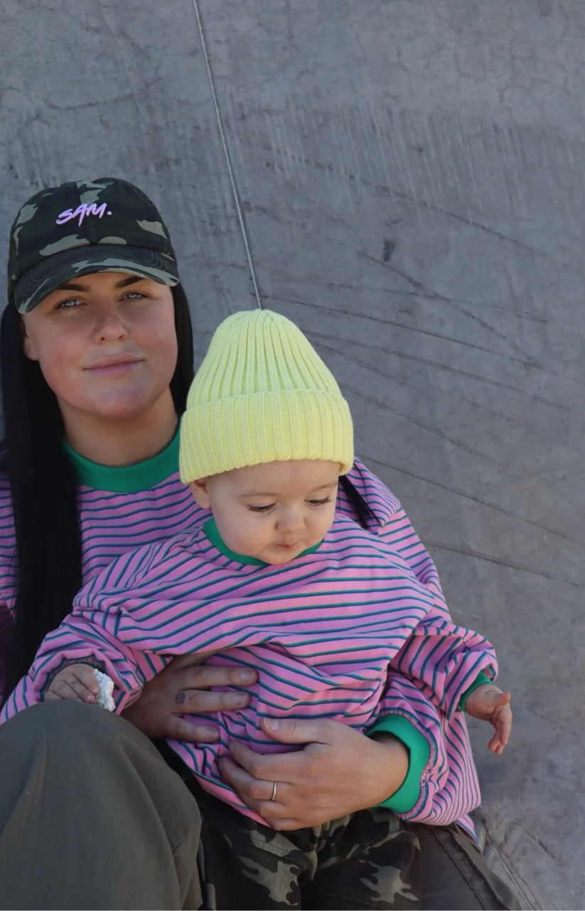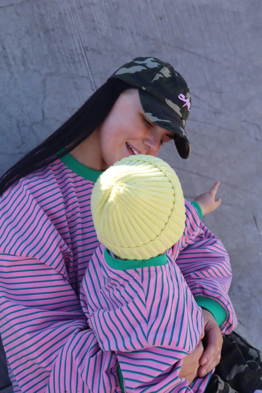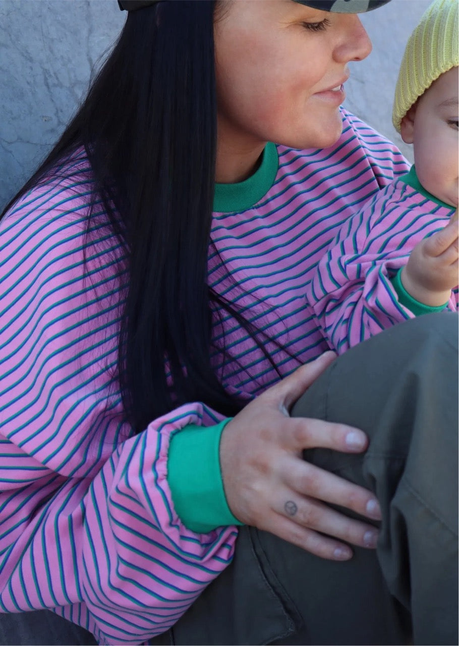 The Watermelon Sugar Long Sleeve is cut from soft, stretchy cotton spandex and designed with an oversized unisex fit that’s equal parts comfy and cool. With a watermelon pink base, fresh green trim, and playful navy stripes, it’s giving effortless streetwear energy with a nostalgic twist.