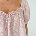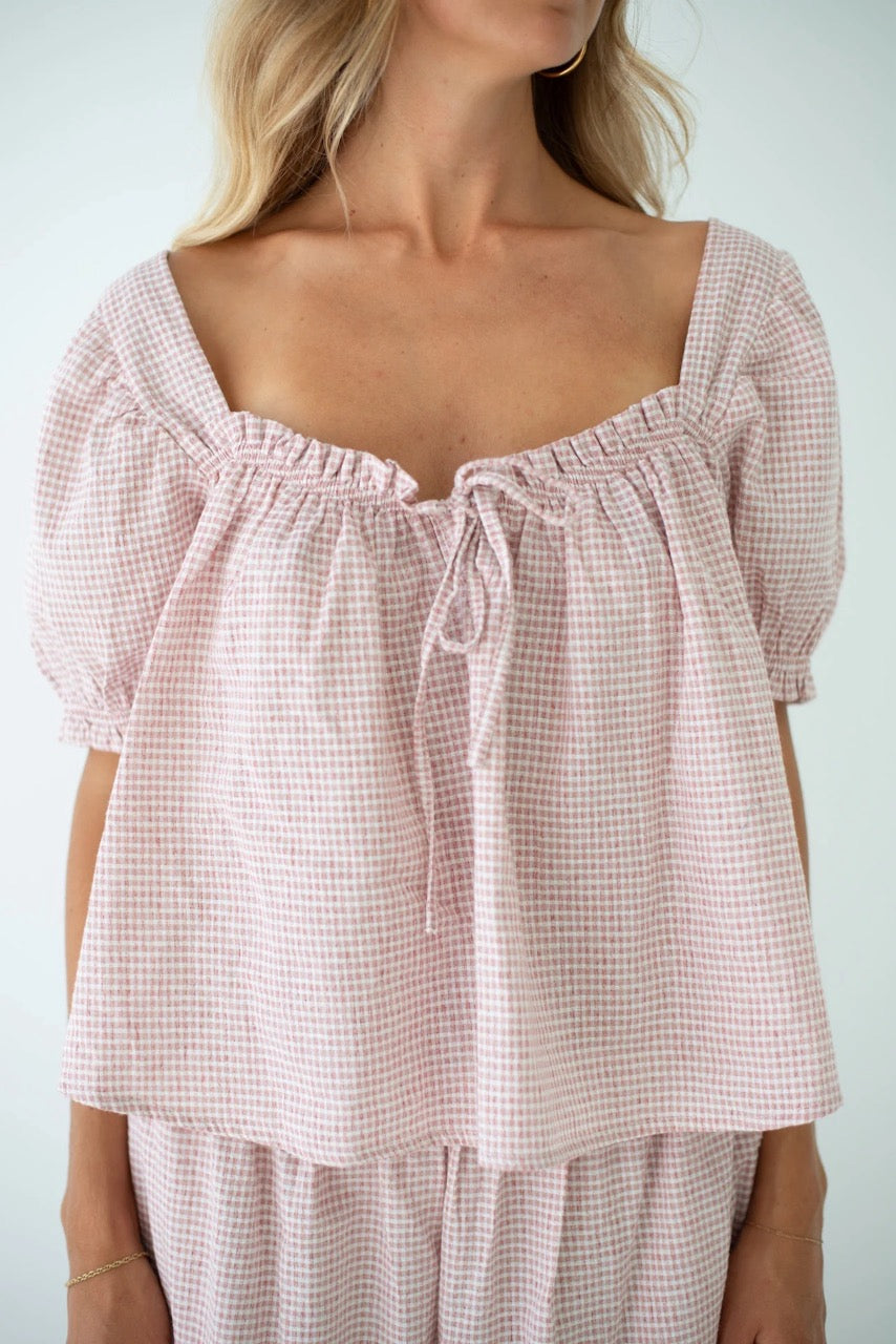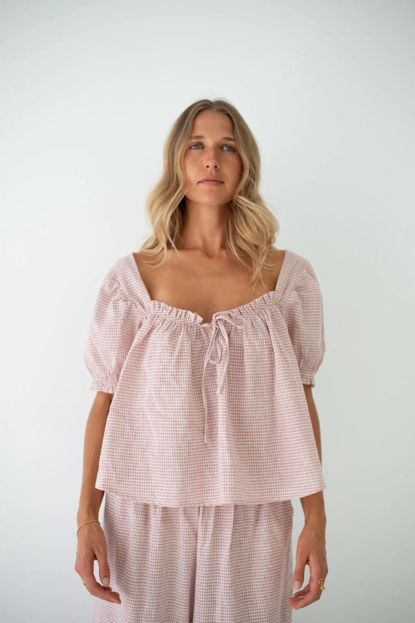 The Ava Blouse is a new season style designed to bring a playful, feminine touch to your everyday wardrobe. With an elasticated bust and tie-front detail, it flatters while remaining effortlessly comfortable. Sweet puff sleeves with gentle elastic add charm, making it a versatile piece for both casual days and dressed up moments. Pair it back with denim for an easy daytime look, or style with any TBR bottoms when you want something a little more elevated. A timeless blouse with endless styling potential. Crafted from a lightweight blend of 15% Linen and 85% Cotton in our exclusive Dusty Rose Check, the Ava Blouse feels soft and breathable against the skin.