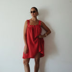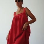 Fall in love with the Juno Mini Dress — a dreamy remake of a 1970s classic. Crafted from the softest double-gauze cotton in a bold romantic red, this piece floats effortlessly with every step. Featuring a lowered square lace-trim neckline and hidden pockets, it’s feminine, nostalgic, and made to make you feel something special.