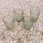 Our set of four Tumblers feature an embossed design made from a durable, thick glass. Decorative and functional, their embossed texture adds elegance to any cold beverage at your picnic or home.