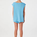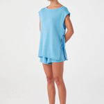 A lightweight summer short with a relaxed fit and soft texture, designed for warm days and effortless layering. The Paige Short in Cyan features subtle panel detailing and an adjustable drawcord waist for comfort on the go.