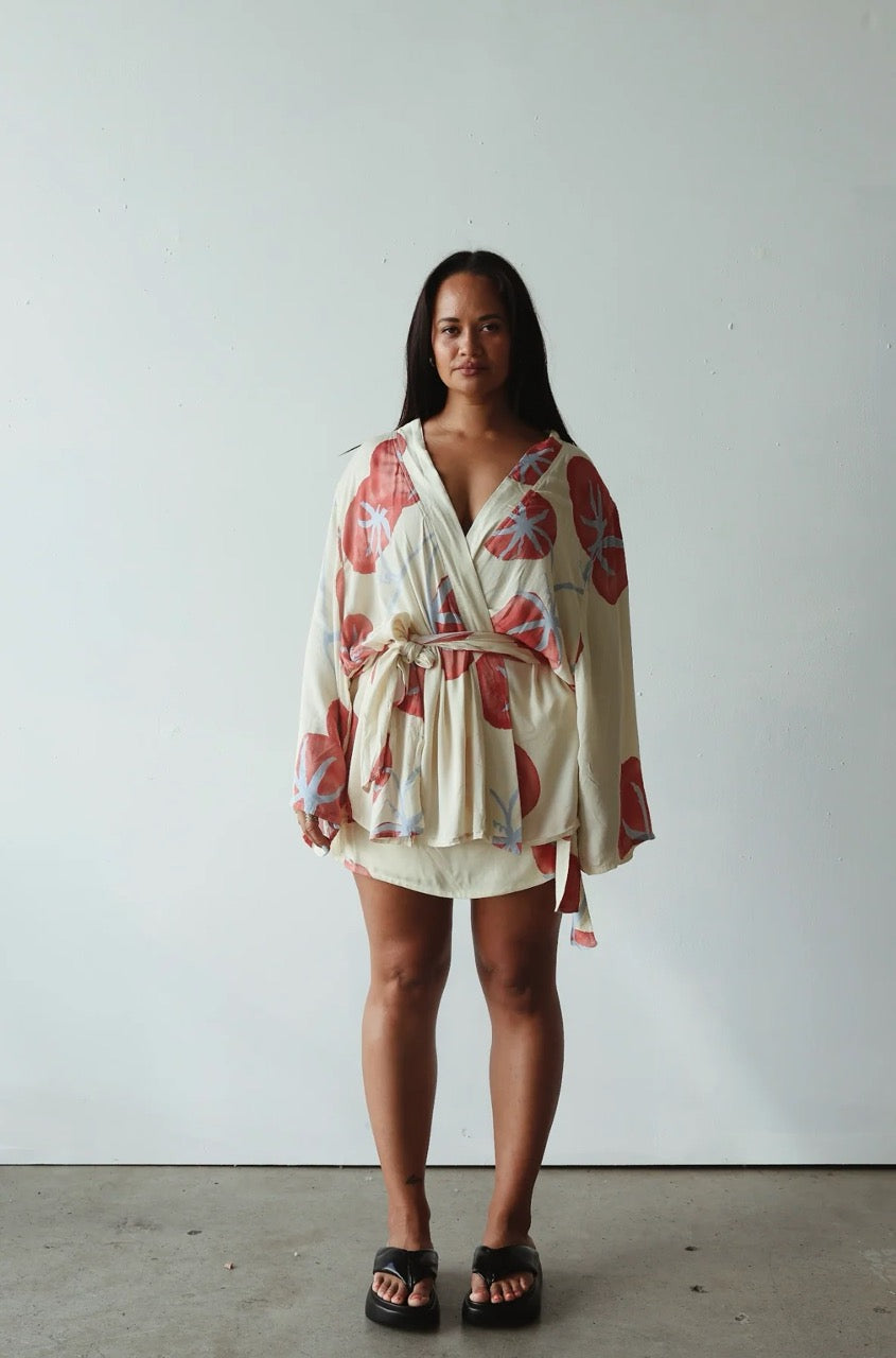 A little bit resort, a little bit everyday. Made from 100% rayon, this sarong-style mini features a soft elastic waistband and a front tie for easy wrap-and-go styling. The tomato print brings a hit of colour, while the lightweight drape keeps it breezy and versatile. Wear it with the Luella Kimono or throw it over swim — either way, it’s a no-thought styling win.