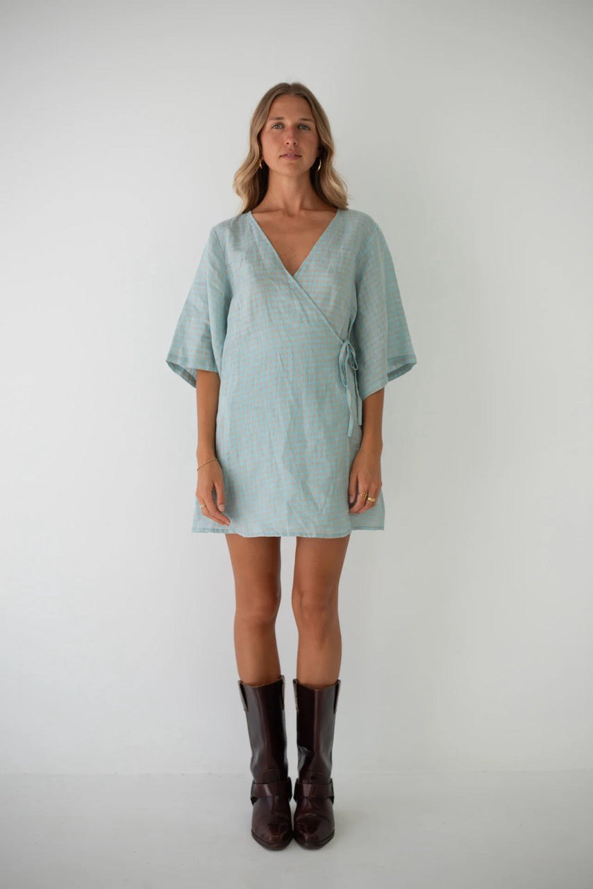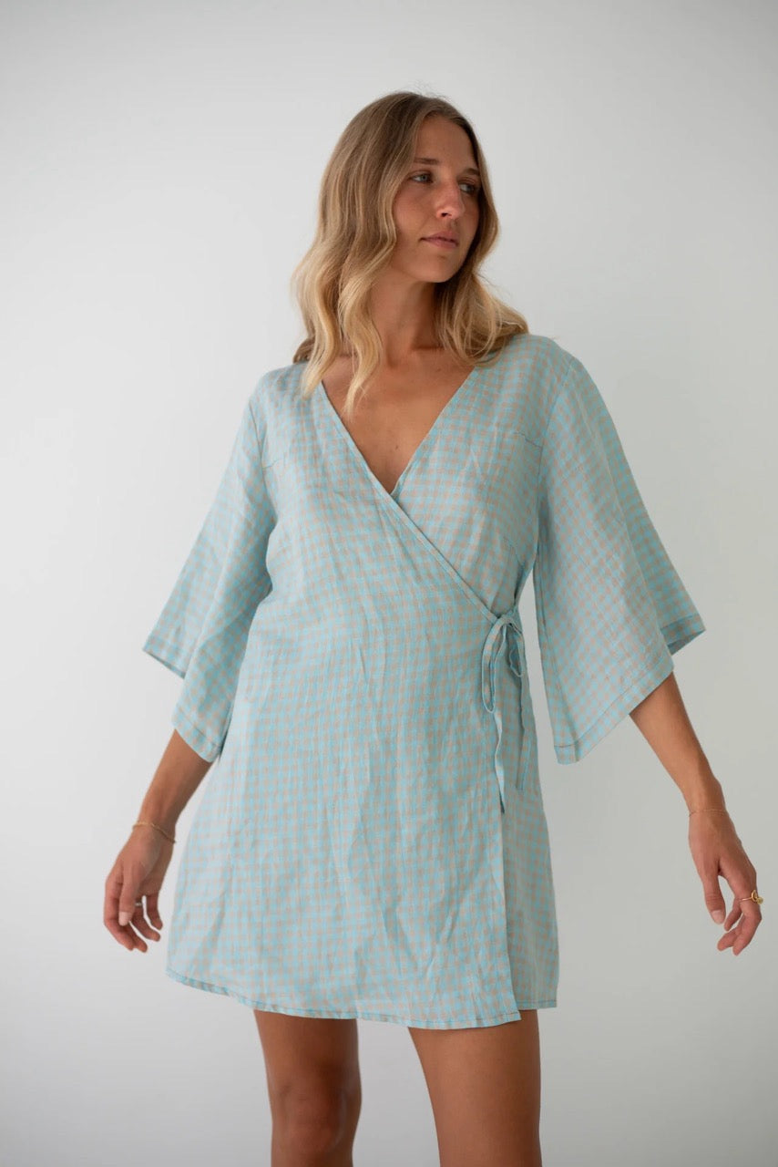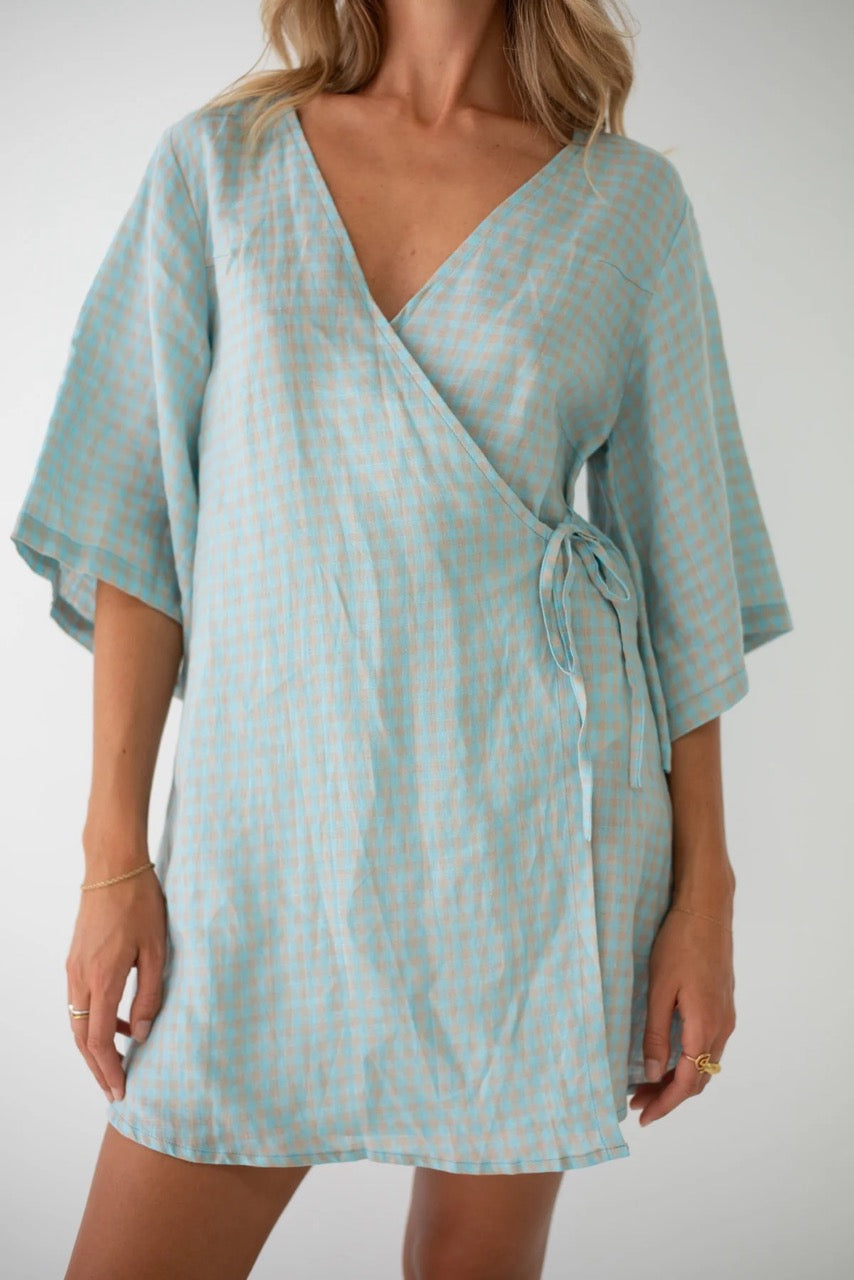 Mia Wrap Mini Dress- Blue Beige Gingham