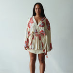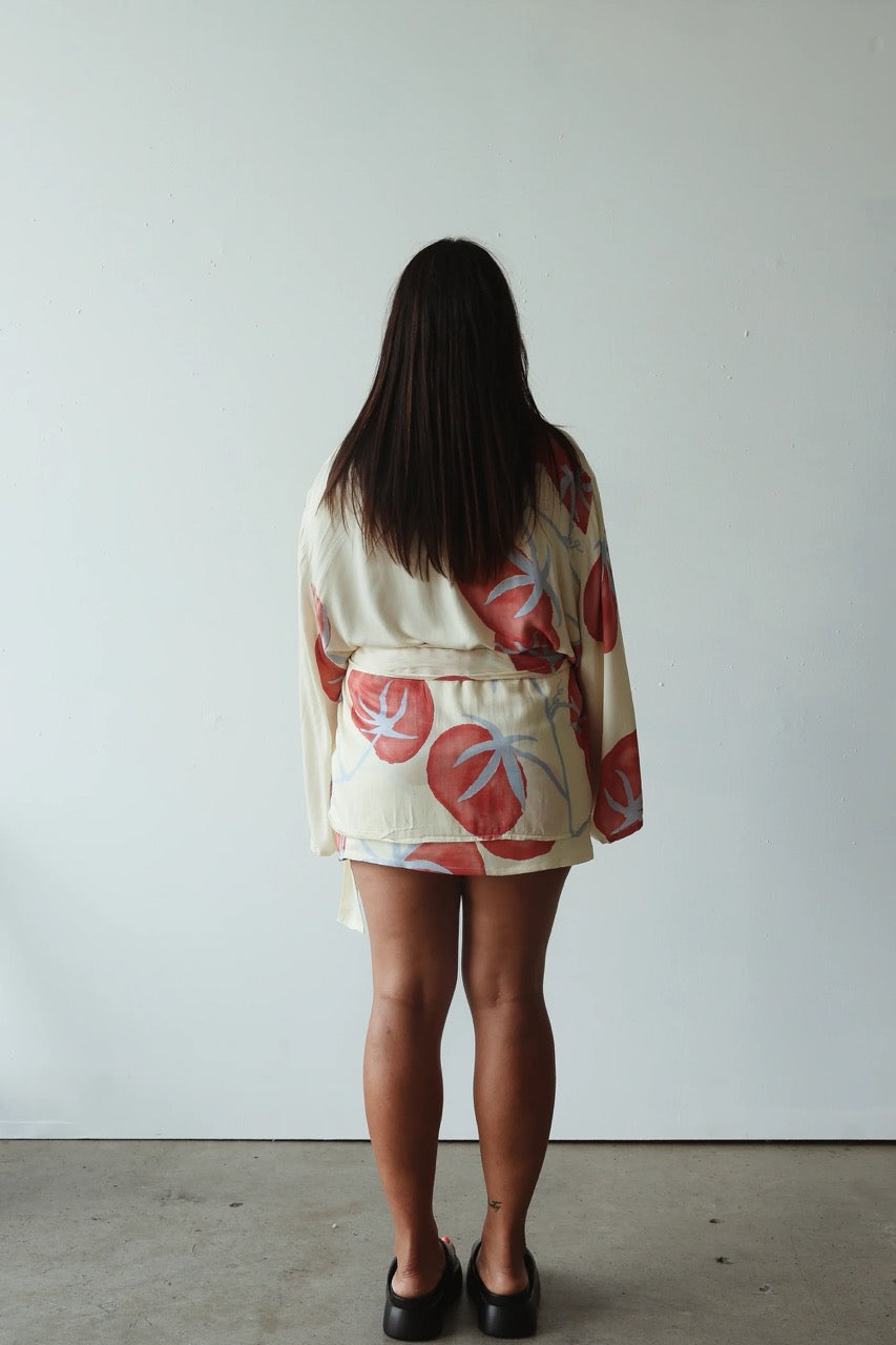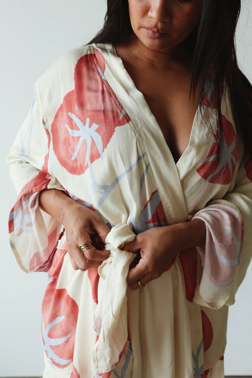 Made from 100% rayon, the Luella kimono features wide sleeves and a self-tie waist for flexible styling. Wear it open and easy like a lightweight cardigan, or tie it firm for a more structured silhouette. Perfect layered over swim or paired with the Minnie Short — this one moves from beach to brunch with ease.