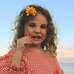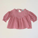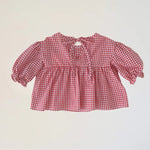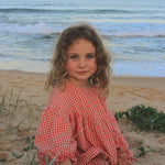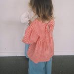 Designed for your daughter’s sweetest moments, this gingham top is full of sweet little details, from the frilly puff sleeves, dipped front yoke, and tie-up back.