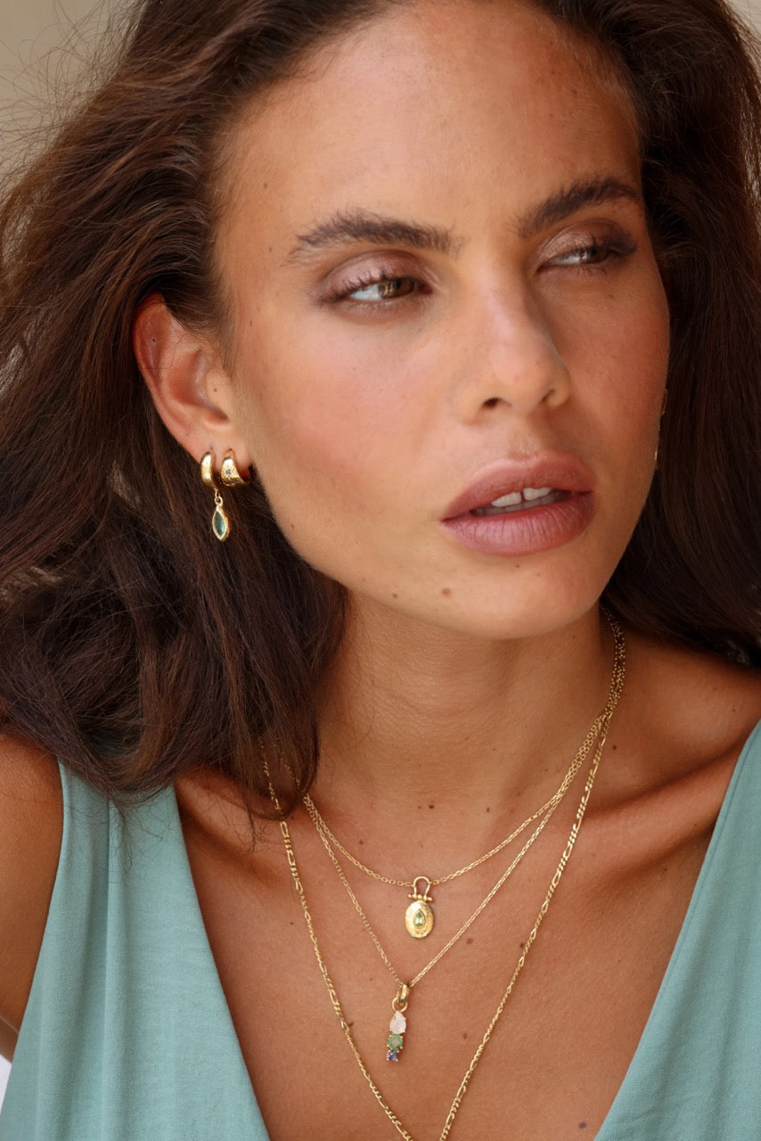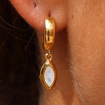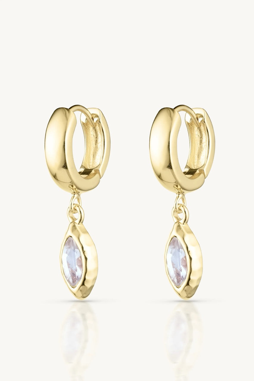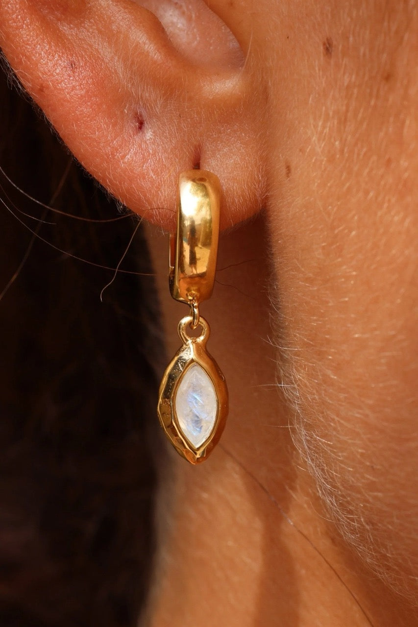 The Belle Huggies are the baby version of our Isabella Marquise Earrings. They are a stunning single marquise stone drop Huggies set available in either Moonstone or Apatite.