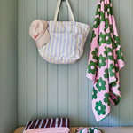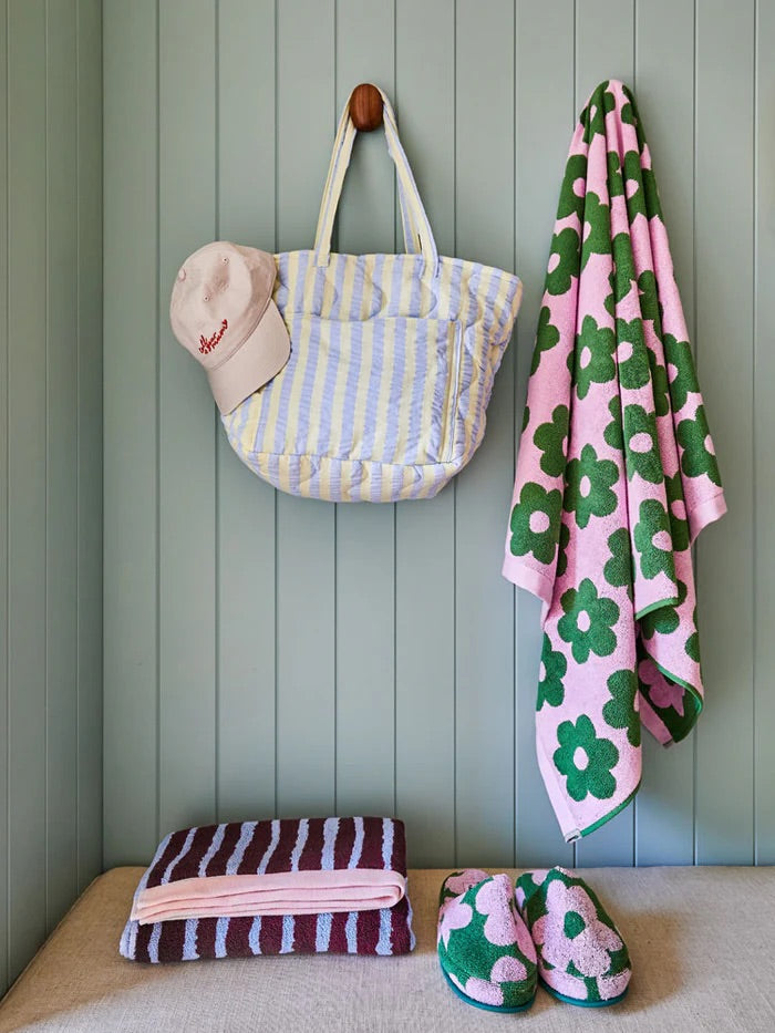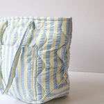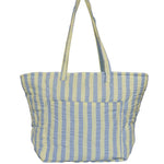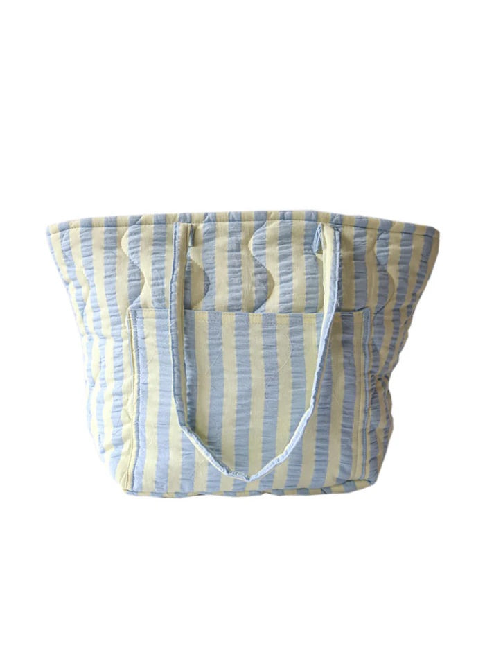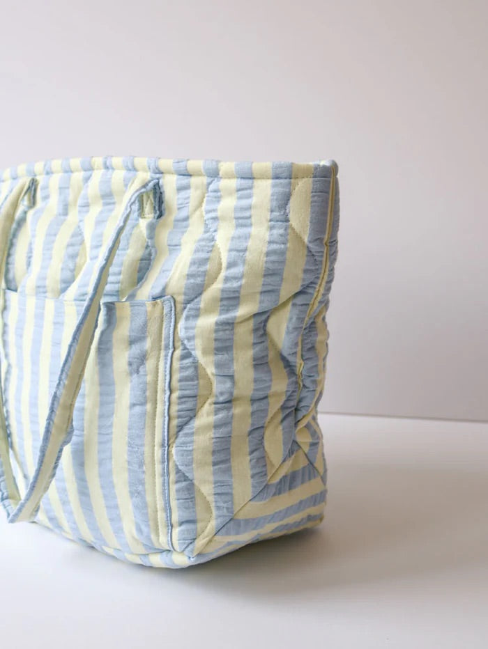 Introducing the Butter Blue Seersucker Quilted Bag – a versatile tote designed to add a bit of fun to your everyday. Made from 100% cotton in our seersucker stripe fabric in butter yellow and celeste blue, this lightweight bag is perfect for everything from daily errands to beach days and even as a chic nappy bag.