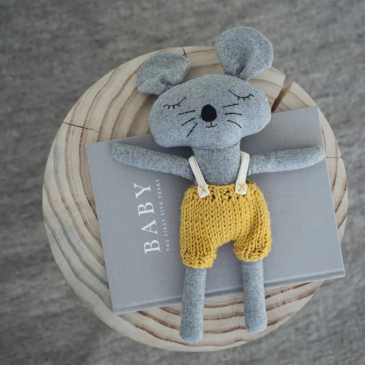 Made with the softest wool blend fabric, Charlie wears mustard hand knitted Australian merino wool overalls.