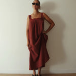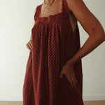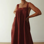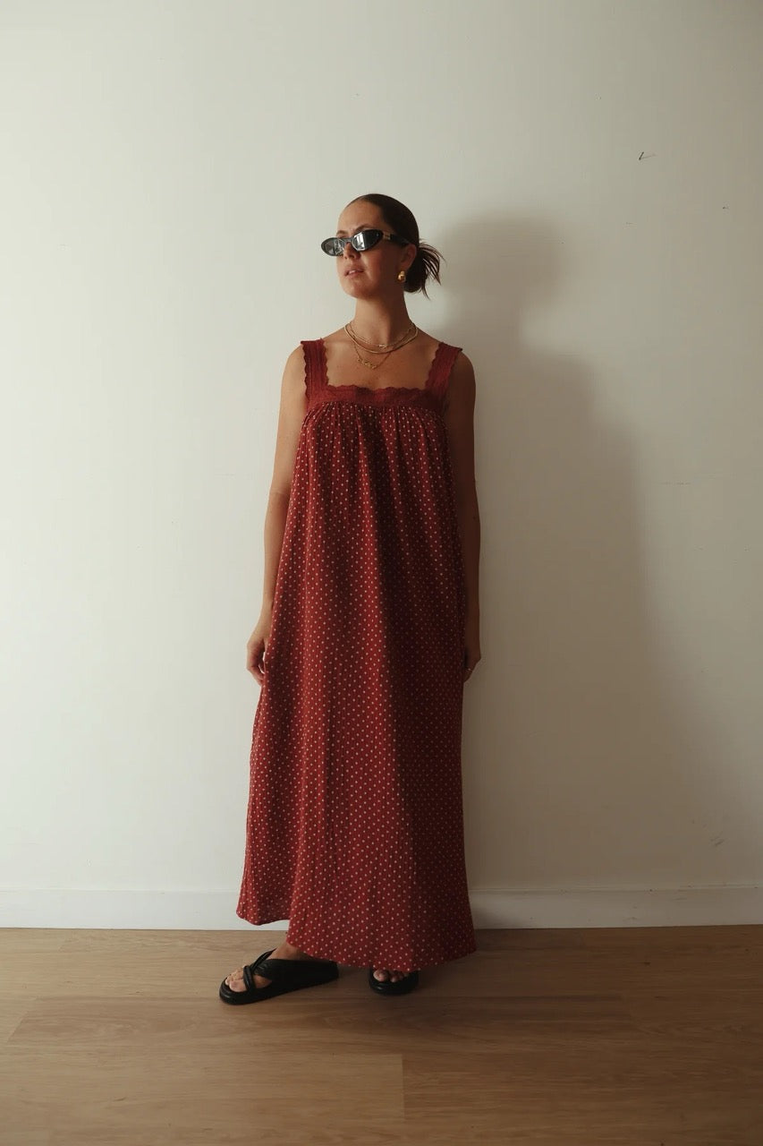 A vintage inspired, Relaxed slip with a floaty silhouette and elegant square neckline, Finished with delicate lace trim detail. Designed with practical side pockets and an ankle to mid length for versatile wear. Cut from a black polka dot cotton gauze. Thoughtfully made to be pregnancy and breast feeding friendly.