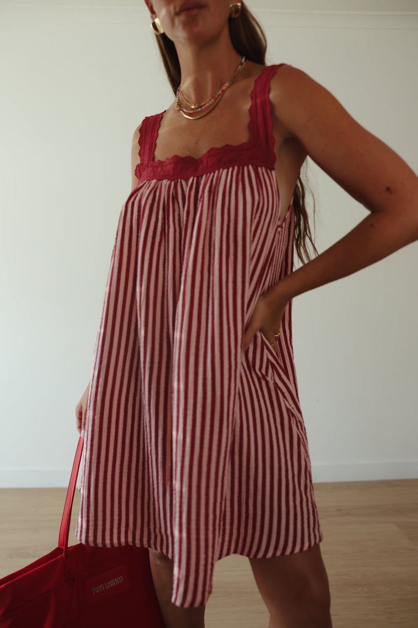 Fall in love with the Juno Mini Dress — a dreamy remake of a 1970s classic. Crafted from the softest double-gauze cotton in a fresh green stripe that instantly feels like summer on the skin. This piece floats effortlessly with every step. Featuring a lowered square lace-trim neckline and hidden pockets, it’s feminine, nostalgic, and made to make you feel something special.