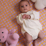 Made from 100% cotton, it features a textured tangerine and lilac seersucker check on one side and a solid lilac cotton on the reverse - giving you two looks in one. The wavy quilting pattern adds extra personality, while the 320gsm cotton wadding fill ensures it's plush, soft, and comfortable for little ones to stretch, roll, or snooze on.