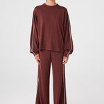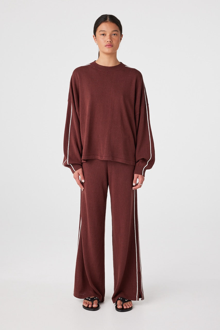 An oversized long sleeve tee in a linen–organic cotton knit that feels dry and breathable in warmth, with a relaxed drape that doesn’t cling. Drop shoulders and contrast stripe detailing create an easy shape for travel days, cool evenings and air-conditioned spaces.