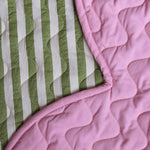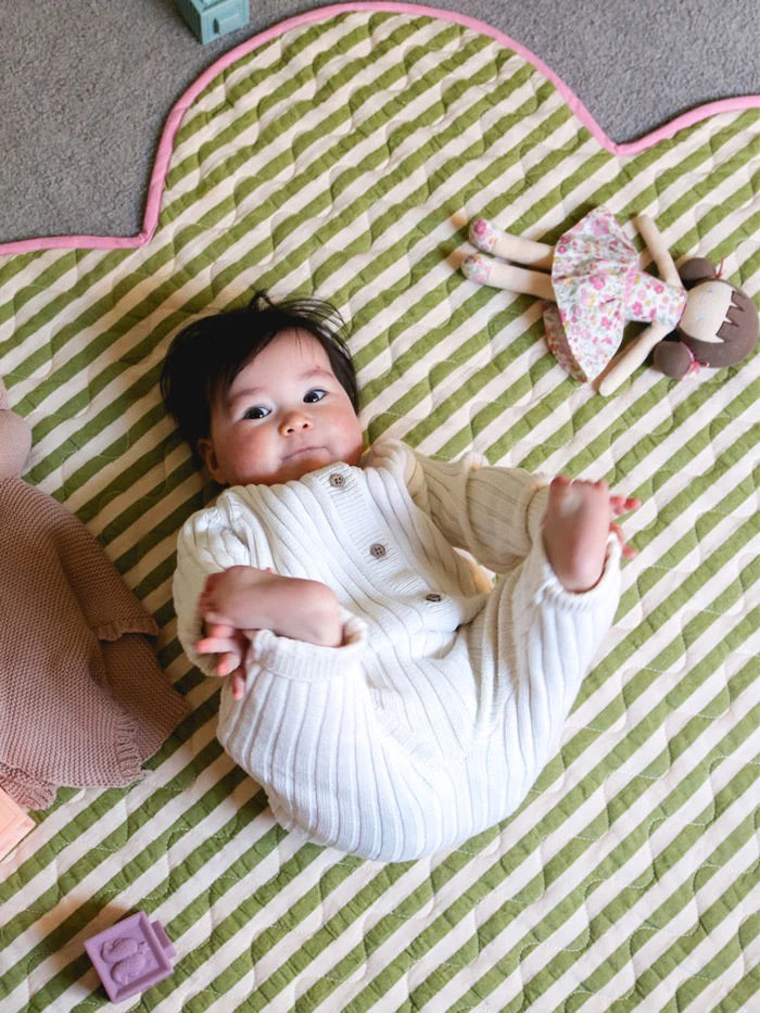 Made from 100% cotton, it features a textured pistachio and cream seersucker stripe on one side and a bold bubblegum pink cotton on the reverse - giving you two looks in one. The bubblegum piping trim and wavy quilting pattern add extra personality, while the 320gsm cotton wadding fill ensures it's plush, soft, and comfortable for little ones to stretch, roll, or snooze on.