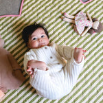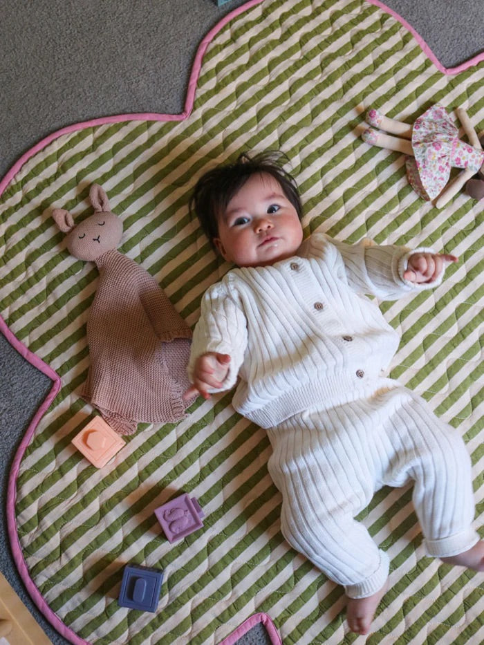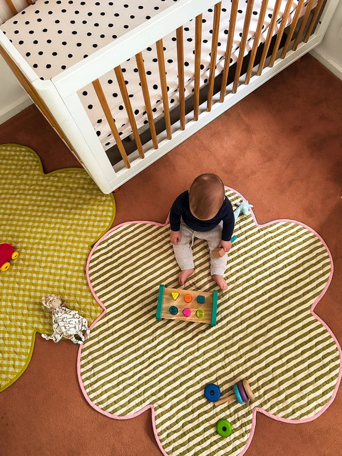 Soft, sweet, and full of charm, the Pistachio Seersucker Playmat is made for playful moments and cosy floor time. Designed in our signature flower petal shape, this mat brings a whimsical touch to any nursery, living room, or play space.