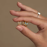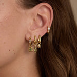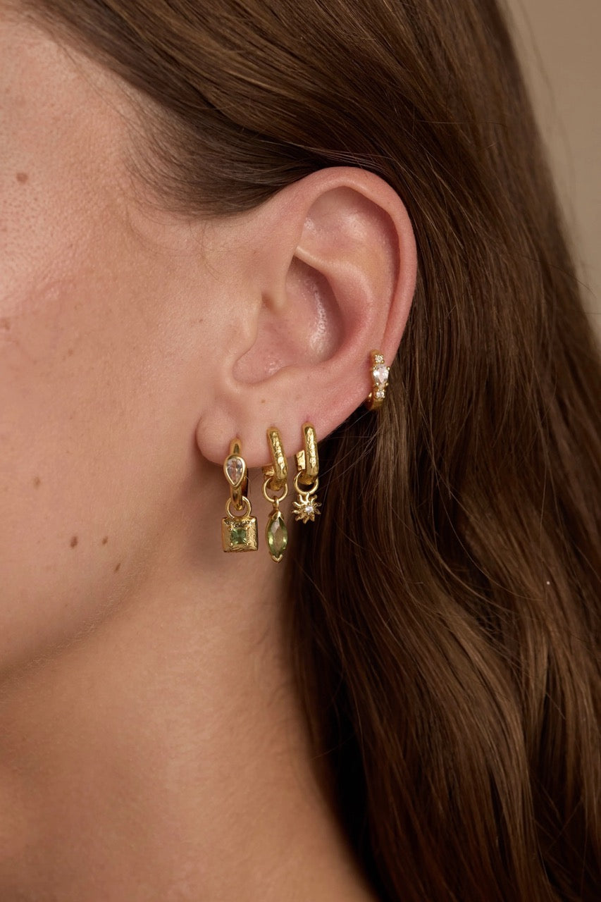 The Textured Topaz Huggies feature three prong-set stones set along a petite textured paperclip huggie. A marquise-cut centre White Topaz stone is flanked by two delicate round Cubic Zirconia stones, creating the perfect balance of shimmer.