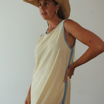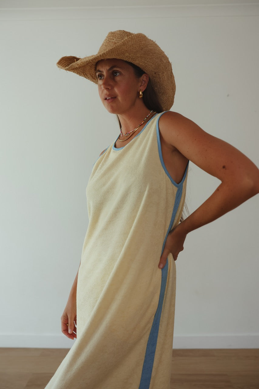 SLIP INTO SUNSHINE WITH OUR HORIZON BUTTER YELLOW TERRY DRESS - YOUR NEW GO-TO FOR BEACH DAYS THAT MELT INTO BREEZY BAR NIGHTS. CRAFTED FROM ULTRA-SOFT TERRY FABRIC THAT FEELS LIKE BUTTER ON YOUR SKIN, THIS FLOATY SILHOUETTE MOVES WITH YOU, CATCHING EVERY WARM BREEZE. A RELAXED, FLOATY FIT FEATURING ROUND NECKLINE, AND CONTRASTING DETAILS.