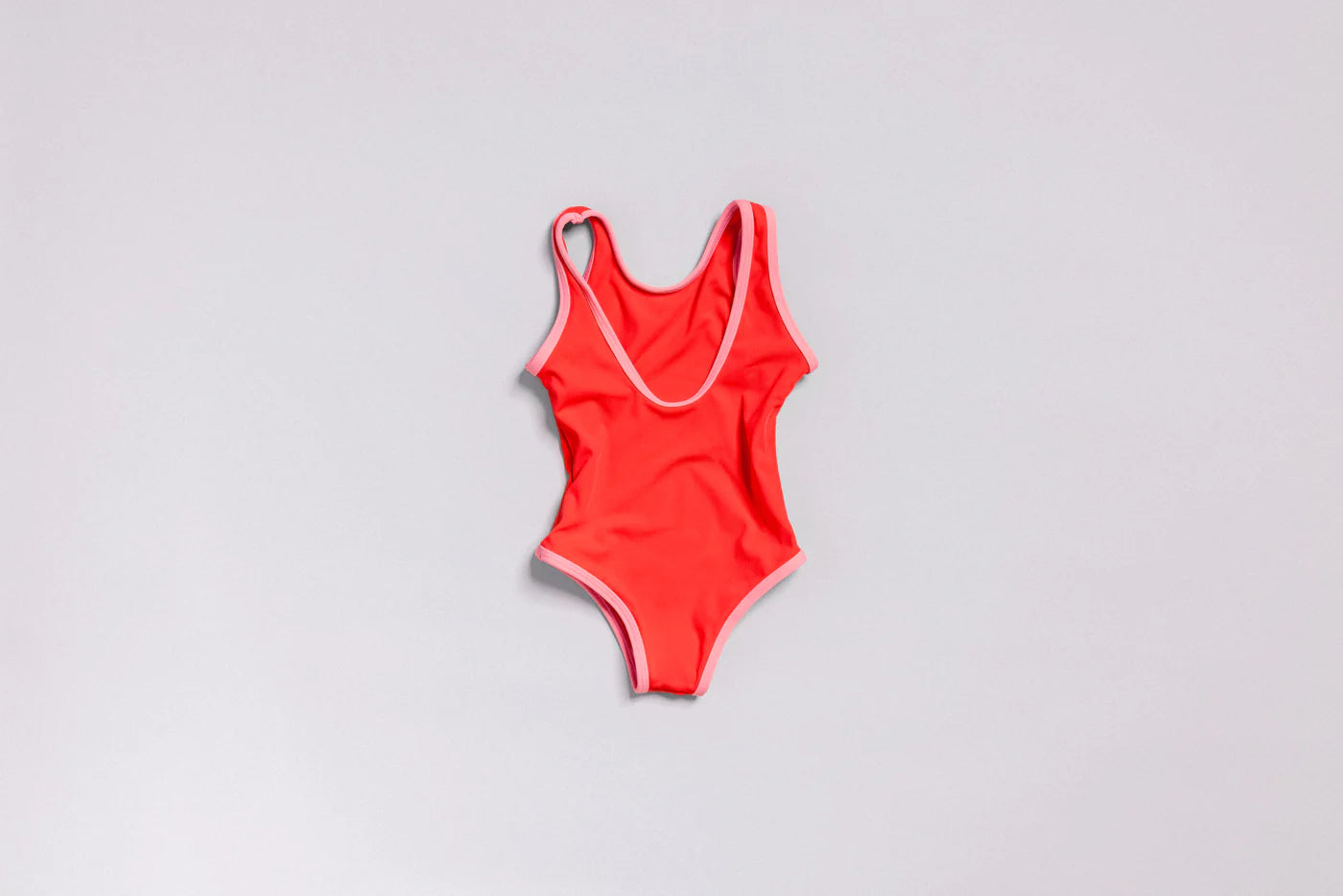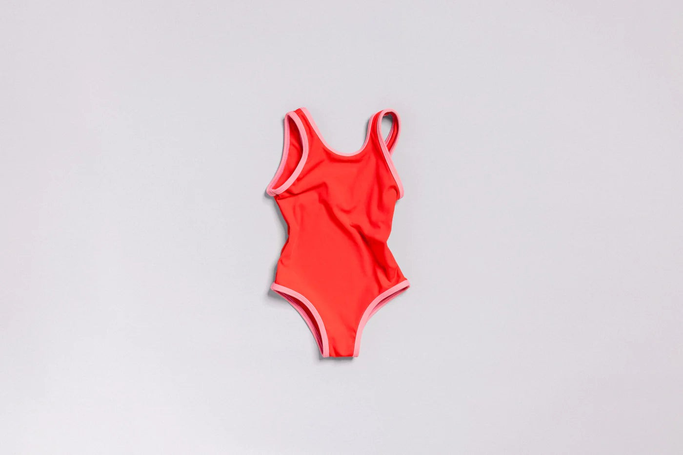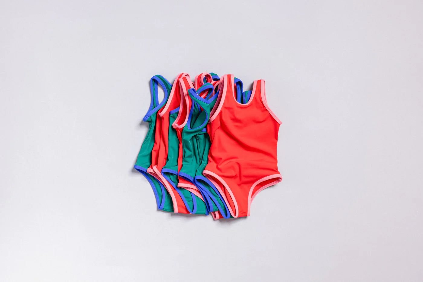 This timeless piece comes in a duo of contemporary colour options and features a sleeveless design with colourful contrast binding — a nod to the 80’s, that we love so much. It is complimented by a delicately scooped neckline and back, and is meticulously crafted and self-lined in high-quality recycled nylon certified by OEKO-TEX. It’s also versatile enough to be worn as a bodysuit for your mini minimalist.